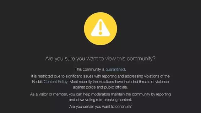 reddit在决心“恰烂钱”后所做的第一步,就是壮士断腕,对平台上不当内容进行了封禁,按照不同程度给出了不同的处理方式。像是联手NBA禁封了转播盗版篮球赛事的版块,又对一些涉及极端政治、宗教命题的版块进行了关停。至于一些濒临踩红线的版块,例如有大量政治仇恨言论的pro Trump,则进行了隔离,用户在进入前,reddit会提醒用户此版块中包含大量不当内容。同时这一版块的内容也不会出现在其他非订阅用户的搜索和推荐之中。