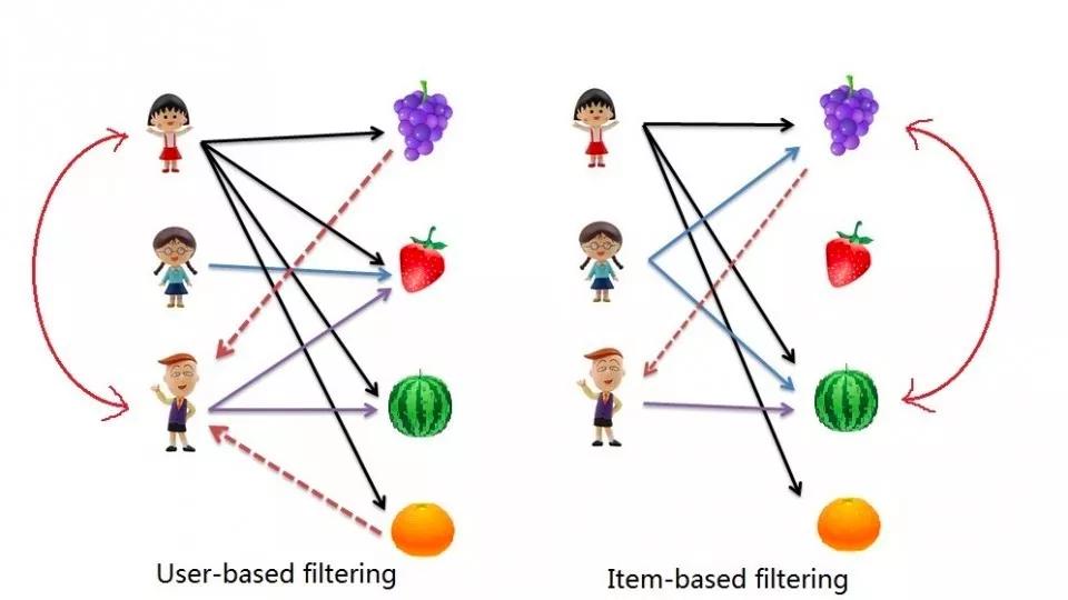 协同过滤算法图示:左边是基于用户的算法,右边是基于物品的算法
