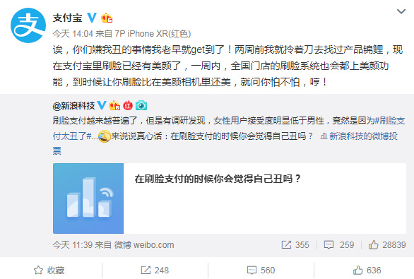 支付宝回应女性用户嫌刷脸支付太丑:一周内全国门店刷脸系统上线美颜功能