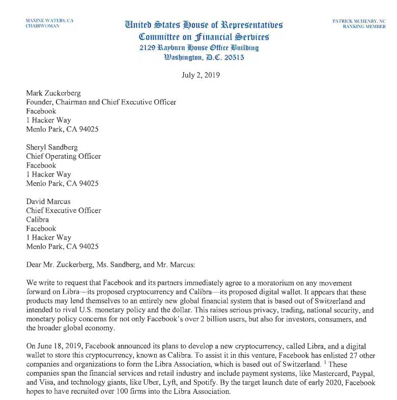 周二,包括 Waters 在内的五名成员向 Facebook 创始人兼首席执行官马克 · 扎克伯格递交了一封信,信中呼吁暂停虚拟货币 Libra 的发展;与此同时,金融服务委员会及其附属小组委员会举行听证会,确定它将如何运作,以及将采取何种保护措施来保护用户隐私。