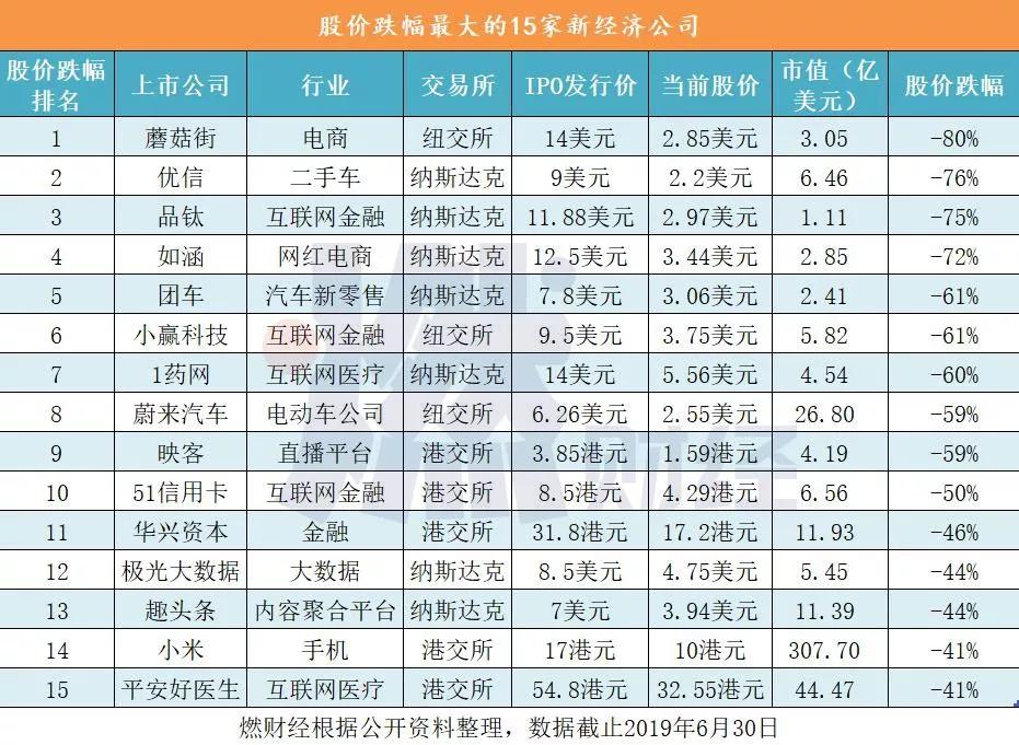 •截至2019年6月30日,境外上市的47家新经济公司中,15家公司股价跌幅超过40%,蘑菇街、优信、品钛包揽跌幅前三名;