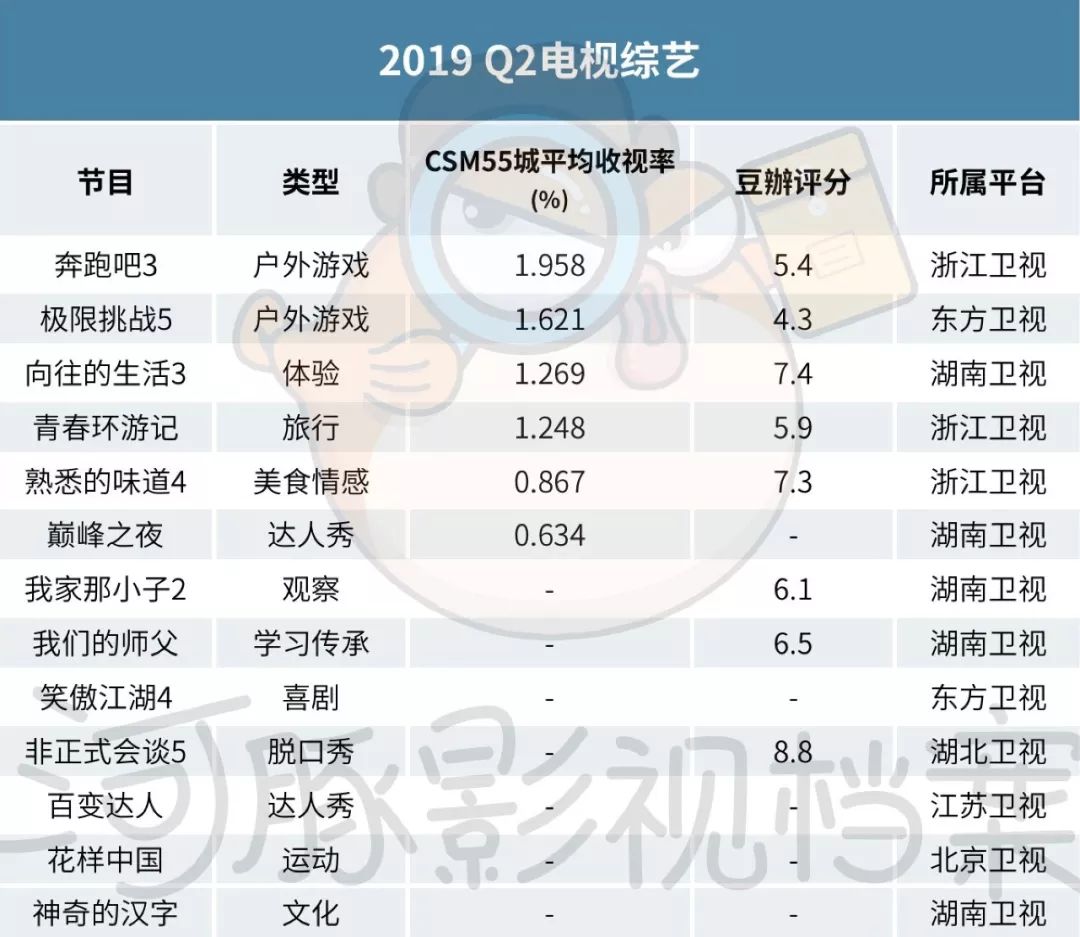 1、 二季度电视综艺头部扎堆且展示出属于头部的影响力,平均收视破1的节目达4档,比一季度多出两档,但除了《向往的生活3》口碑尚可之外,其他三档节目未过及格线。果然只有顶级综N代才能“救”台综。