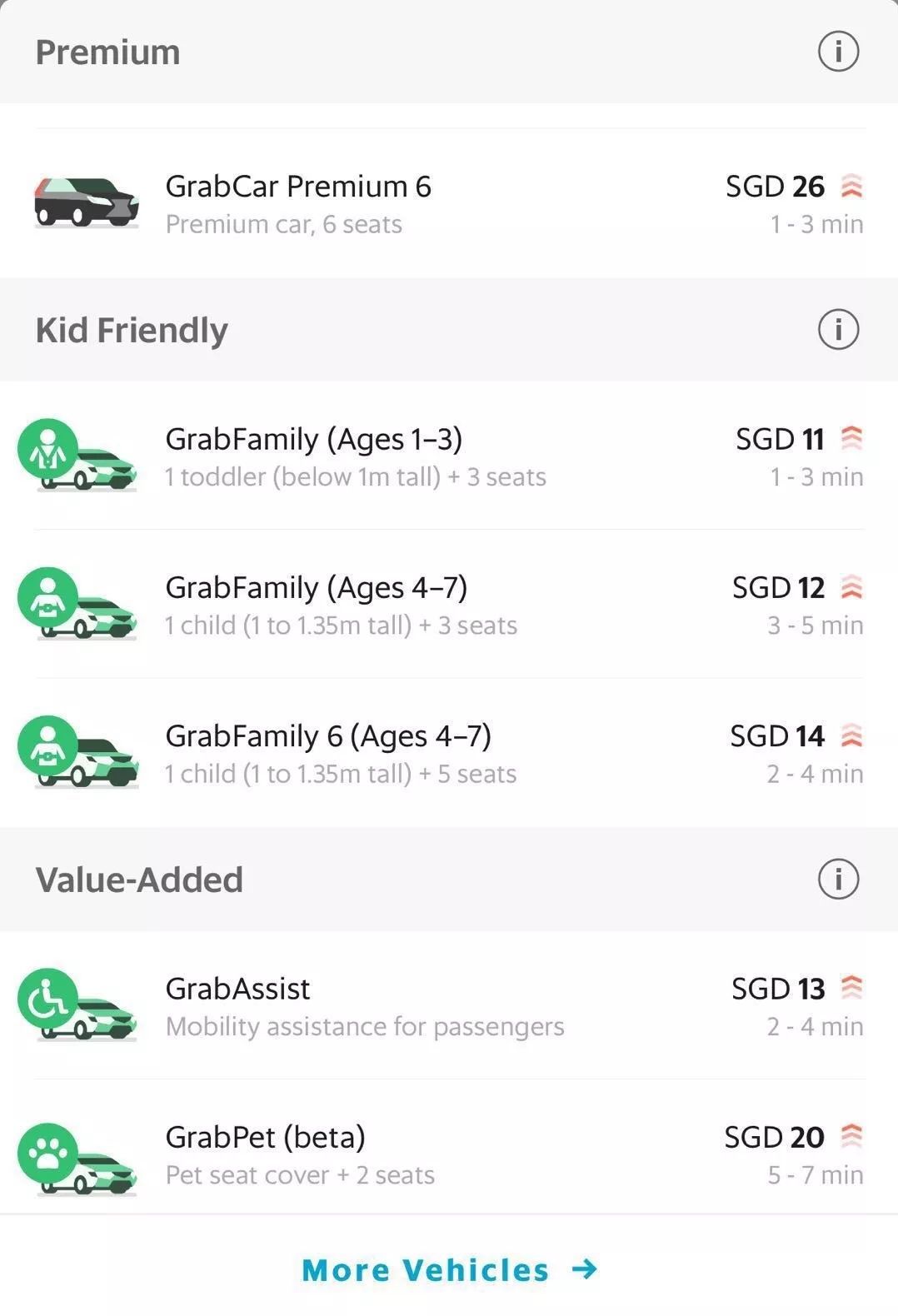 比如 Grab 针对性推出适合越南/泰国/印尼的 GrabBike、柬埔寨的 GrabTukTuk、菲律宾的 GrabTrike;针对养宠物的用户,有专门的 GrabPet 服务,提供宠物箱等所有相关物品,司机也是经过培训的宠物训练师;GrabFamily 服务则面向带小孩出行的家庭,为1-3岁和4-7岁小孩不同高度的安全座椅。
