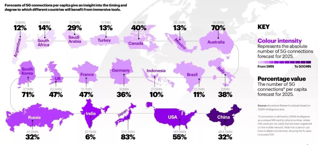 以G20各国为例,到2025年,预计各国5G总连接数将达500万-5亿个之间,其中中国以4.6亿个领跑;日本、韩国、澳大利亚和美国则在人均连接数占优。意味着这国家将率先在5G普及过程中受益。