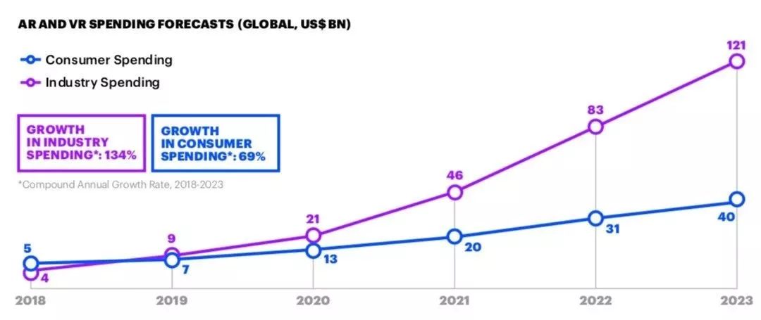 劳动力培训效率的提高是其中的关键环节。据IDC预测,在2018年至2023年间,AR培训支出将以46%的年复合增长率持续上升,在2023年达到80亿美元以上。