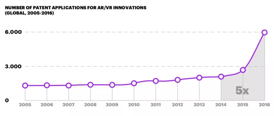 AR领域正在经历爆炸式的创新增长。2014-2016年这段蓬勃期,该领域在全球的专利申请量增长了五倍。