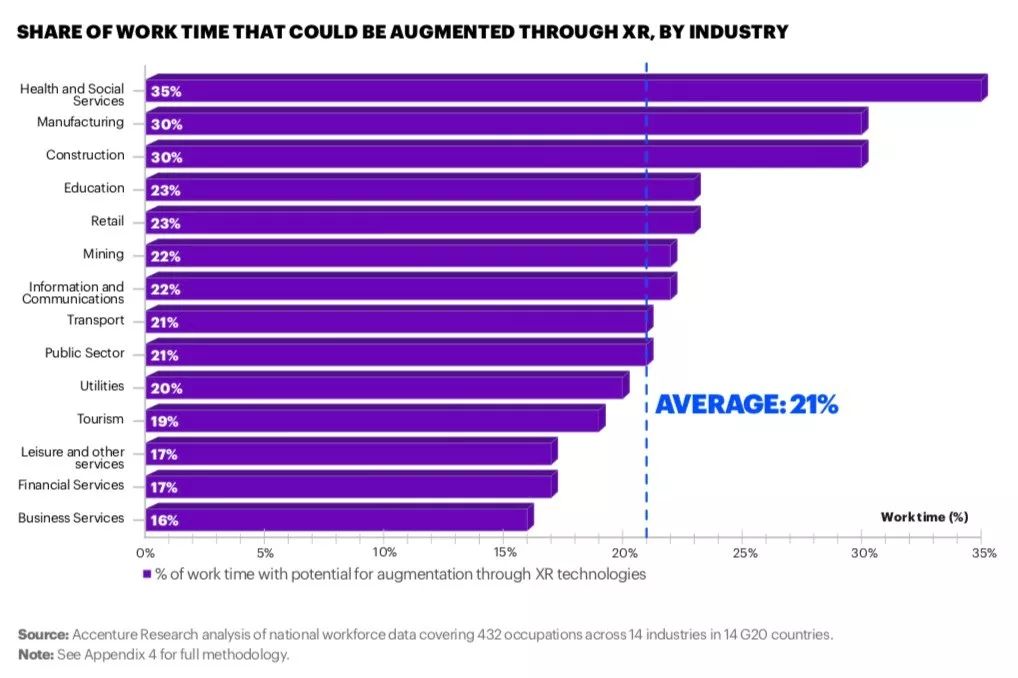 To B的关键是为企业带来高投资回报率,而生产力增长是产业发展的底层动力。通过埃森哲关于14个G20国家、14个行业、432个职业的劳动力数据,我们发现,几乎所有行业都可以从由AR驱动的强大生产力增长中受益,尤其在医疗、教育、制造业和采矿业。