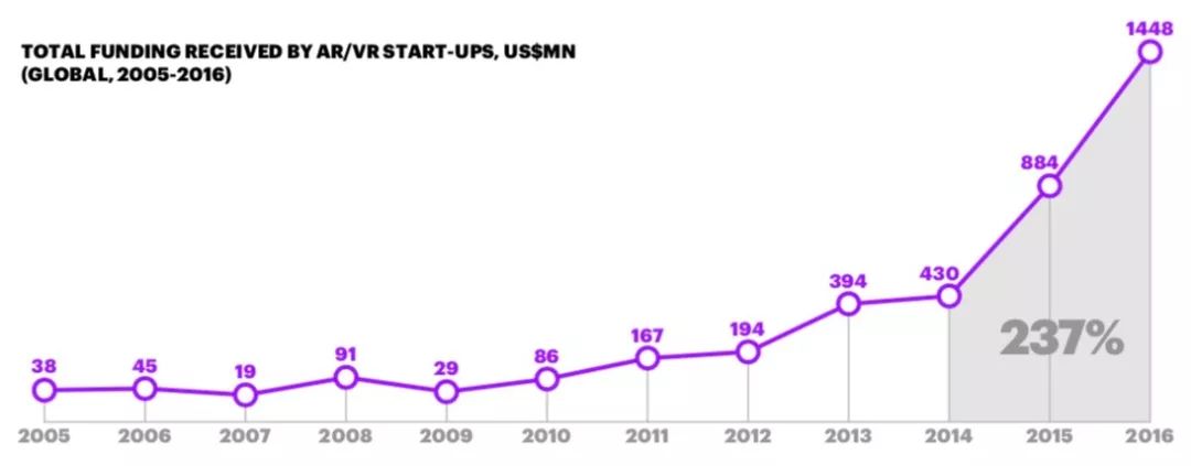 追溯近年来AR相关投融资情况,2012-2016年,以Google Glass问世为标志性事件,针对AR初创企业的融资掀起了持续不断的热潮,2014-2016年增长率甚至达236%。
