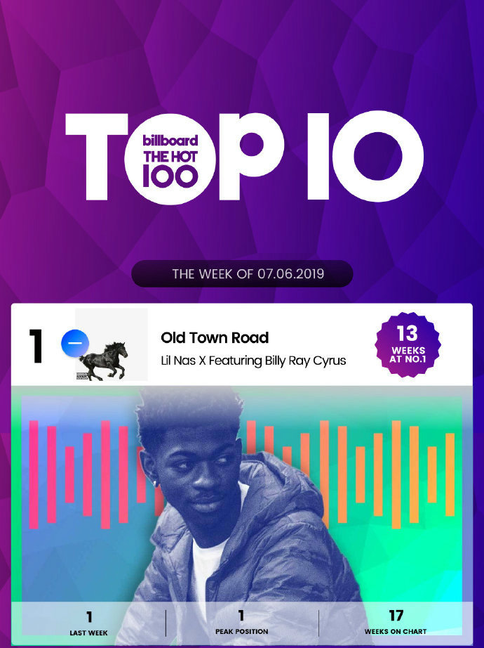 其中最具代表的莫过于美国说唱歌手 Lil Nas X 的单曲《Old Town Road》,这首歌 Tik Tok 爆红后,已经连续 13 周拿到了美国权威单曲榜Billboard Hot 100 第一名,在 Spotify 播放量超过 1 亿,登上 Apple Music 全球排行榜首位。