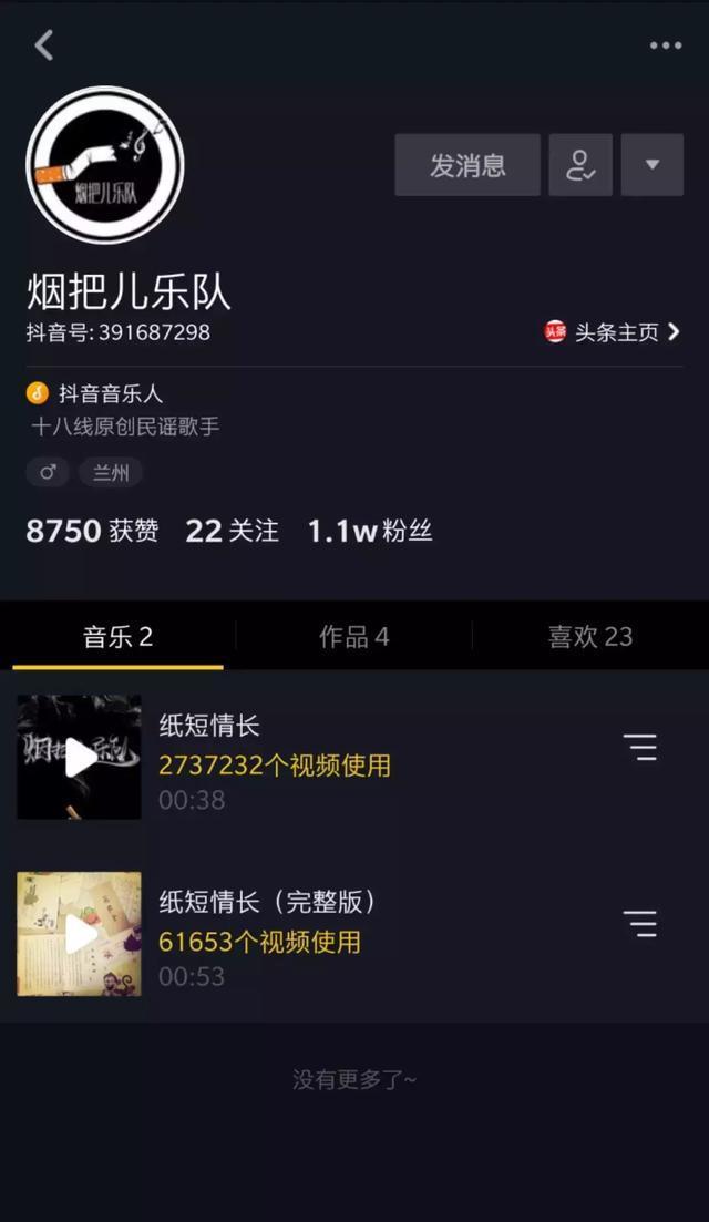 因为歌曲的是主要以背景音乐的形式传播,很多时候歌曲并不是主角,更不用说创作者了。娱乐资本论一篇报道指出,抖音音乐人很难将音乐的使用量转化为自己的人气,比如使用量达 270 多万的《纸短情长》,其创作者烟把儿乐队的粉丝量只有 1.1 万。