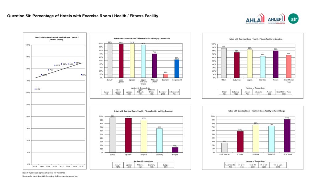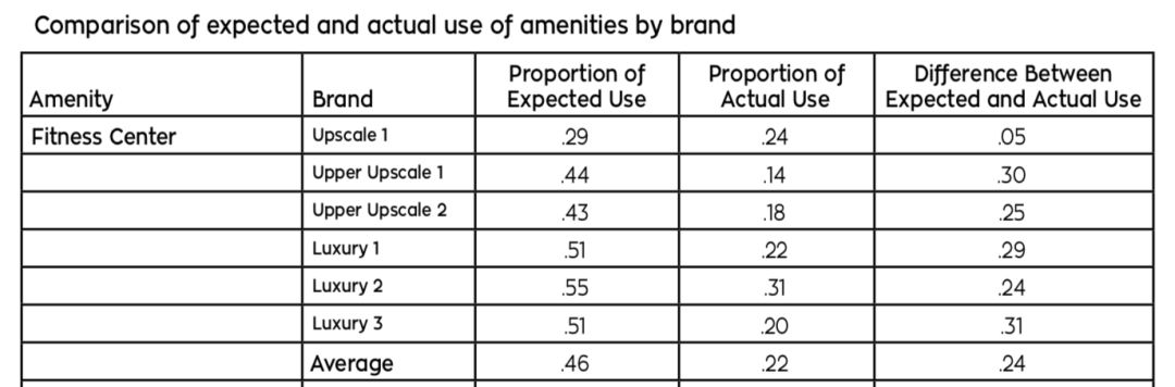 其中,96%的中档偏上的连锁酒店(Upper Midscale Chains)提供健身设施,中档的连锁酒店(Midscale Chains)的这个比例是70%。