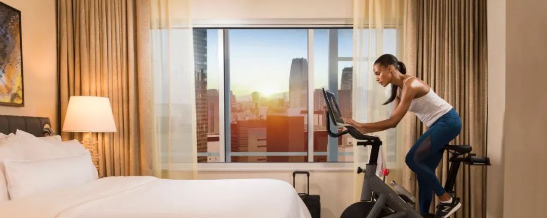 同样的,在客房内推出健身模式的还有威斯汀酒店,通过与美国家用单车品牌Peloton合作,威斯汀在全球30多家连锁酒店推出客房内的单车锻炼。