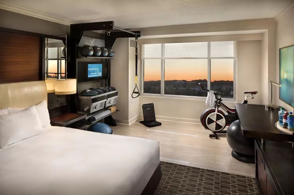 这类酒店客房内配有11件健身器材和配件,包括一台室内自行车和一个小型训练站Gym Rax,并且在房间内配有器械的训练指导视频。同时还会根据住客的需求,个性化提供健身设备。