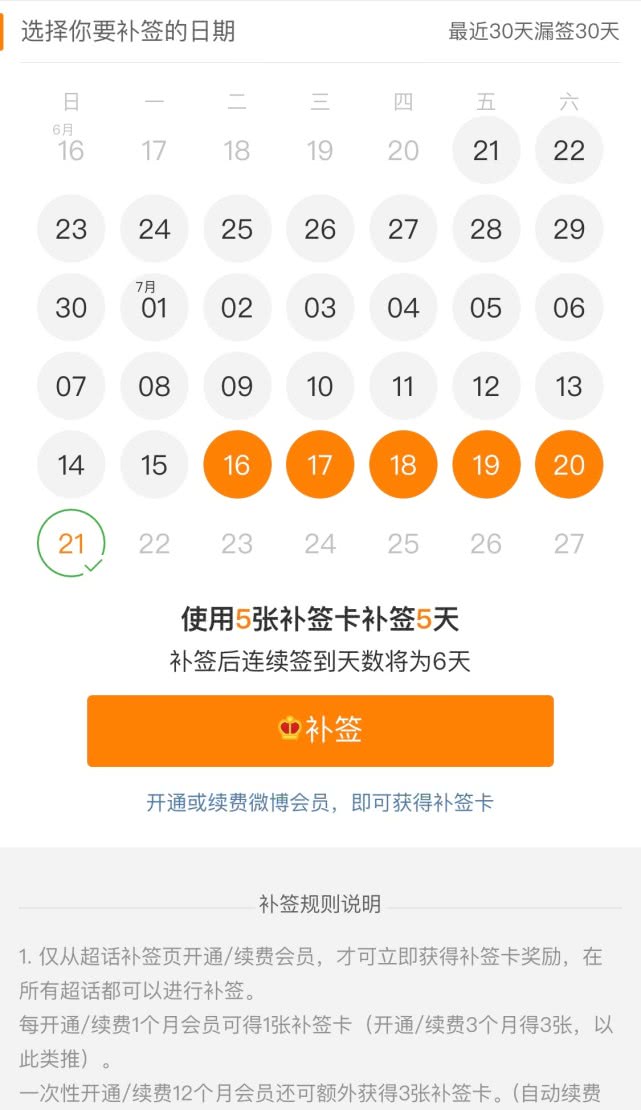 以超话为例,用户签到可获得积分,如果漏签可以通过补签卡补签,但补签卡需开通或续费微博会员才能获得,每开通/续费1个月会员可得到1张补签卡,一次性开通/续费12个月会员还可额外获得3张补签卡。