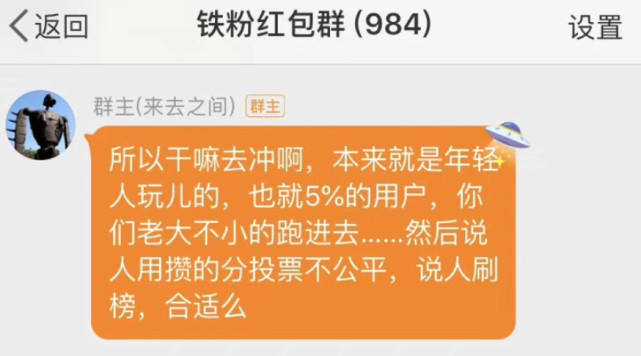 有趣的是,在此次流量PK激战正酣时,微博CEO王高飞在一个群内表示:“本来就是年轻人玩的,也就5%的用户,你们老大不小的跑进去……然后说人用攒的分投票不公平,有人刷榜,合适么?”