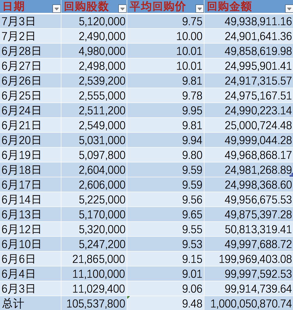 于是,为了提振股价,从6月3日起,小米开始了新一轮回购。截至7月3日,一个月的时间小米共进行了19次回购,总金额达到10亿元。从6月15日至7月3日,小米连续15个交易日回购。