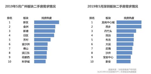 值得注意的是,深圳、广州集中了城市群50.3%的二手房需求量,广州的二手房需求高于深圳,排在大湾区首位;而二手房挂牌量则是深圳占比高于广州。基于城市中细化板块区域,找房热度不尽相同。其中,广州新区、金洲、新塘热度排名前三;深圳龙岗中心城、西乡、丹竹头排最为热门。