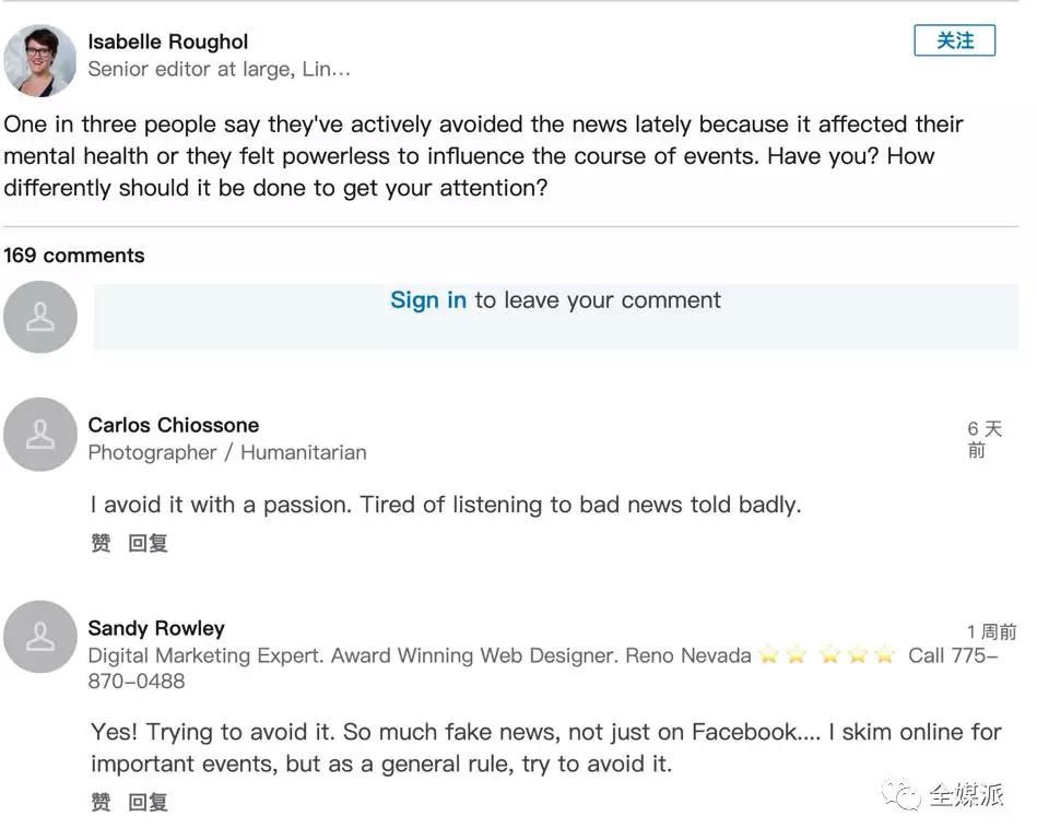 Isabelle Roughol在自己的领英主页抛出“你如何看待新闻回避”这一话题,人们通过评论留下了自己的看法。这一调查虽然不够严谨、科学,但倾听这些来自读者的心声,对了解非新闻从业人员如何看待当下的新闻业依然具有独特价值。