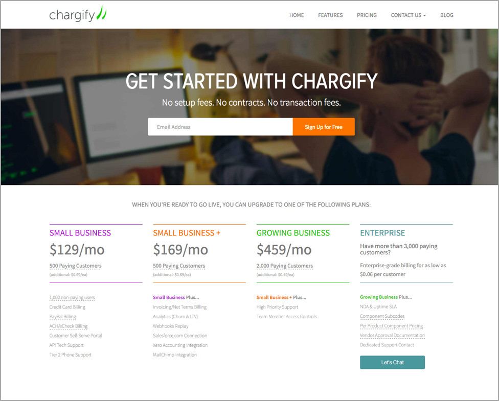 Chargify(美国在线支付服务公司)在网站上展示出简单易懂的价目表,上面只有一些普通的情景匹配至不同的企业规模。