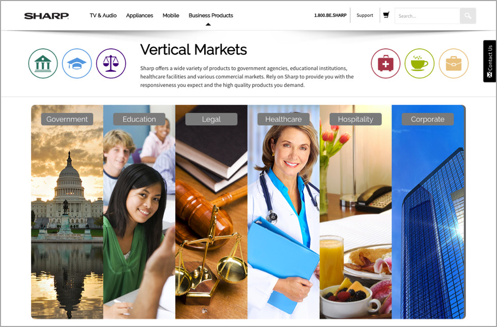 夏普企业官网的浏览导航便是以用户所属行业的类型进行划分。由于部分行业之间有一定程度的重合(例如企业与法律),夏普还提供不同的导航选项,来通过产品类型寻找需要的信息。
