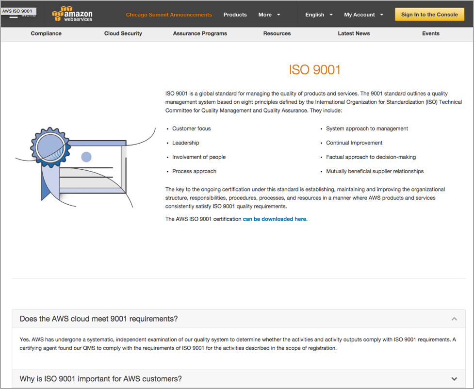 Amazon’s Web Services(亚马逊云计算服务)网站有专门的页面详细介绍其服务,与ISO 9001质量保证体系的匹配,包括介绍这个标准本身,该标准适用的情况,以及其服务与该标准的匹配。