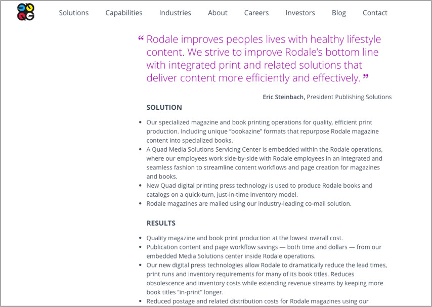 Quadgraphics.com(美国印刷公司)通过案例研究,展示其企业专长和产品是如何解决具体的常规业务挑战的。