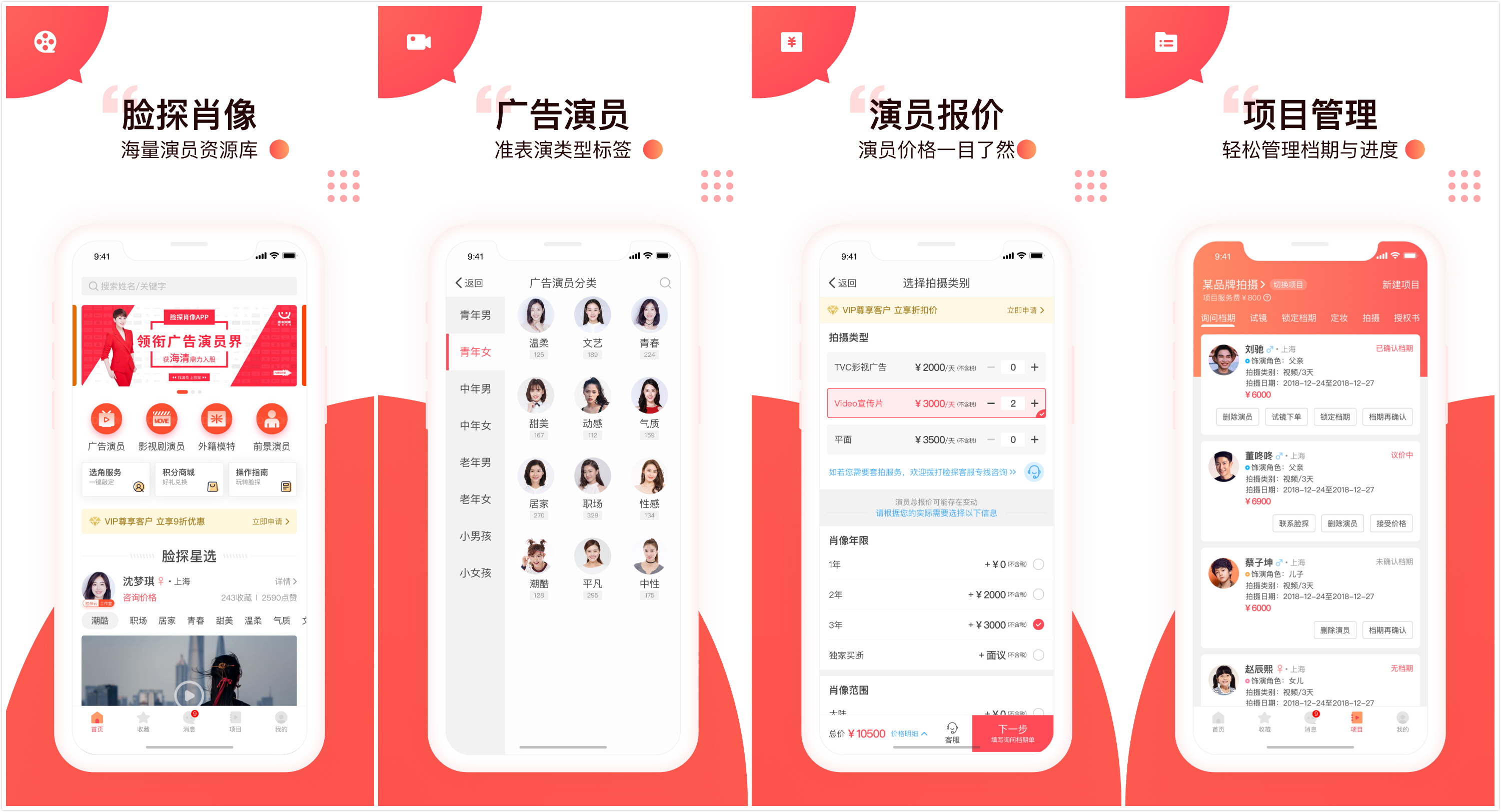脸探肖像APP于2018年11月11日上线,针对传统演艺行业供需对接难、中间商层层加价、服务无标准的问题,搭建了一个直连演艺资源和需求方的互联网平台,供需双方可以直接在线上进行筛选找人、需求配对、报价议价、约档锁档、下单、支付、点评等商务行为,去掉中间环节,提高合作效率。