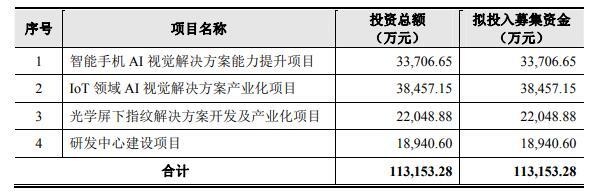 此次IPO募集的资金,将被用于四大投资项目:智能手机AI视觉解决方案能力提升项目,拟使用募集资金3.37亿元;IoT领域AI视觉解决方案产业化项目,拟使用募集资金3.85亿元;光学屏下指纹解决方案开发及产业化项目,拟使用募集资金2.2亿元;研发中心建设项目,拟使用募集资金 1.89亿元。