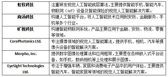 通过对比发现,目前国内的视觉人工智能公司,主要是以深耕垂直行业应用。虹软科技与CorePhotonics Ltd.、Morpho, Inc.的发展路径较为一致,早期致力于手机等消费电子领域的视觉算法,然后向人工智能其他领域扩张。