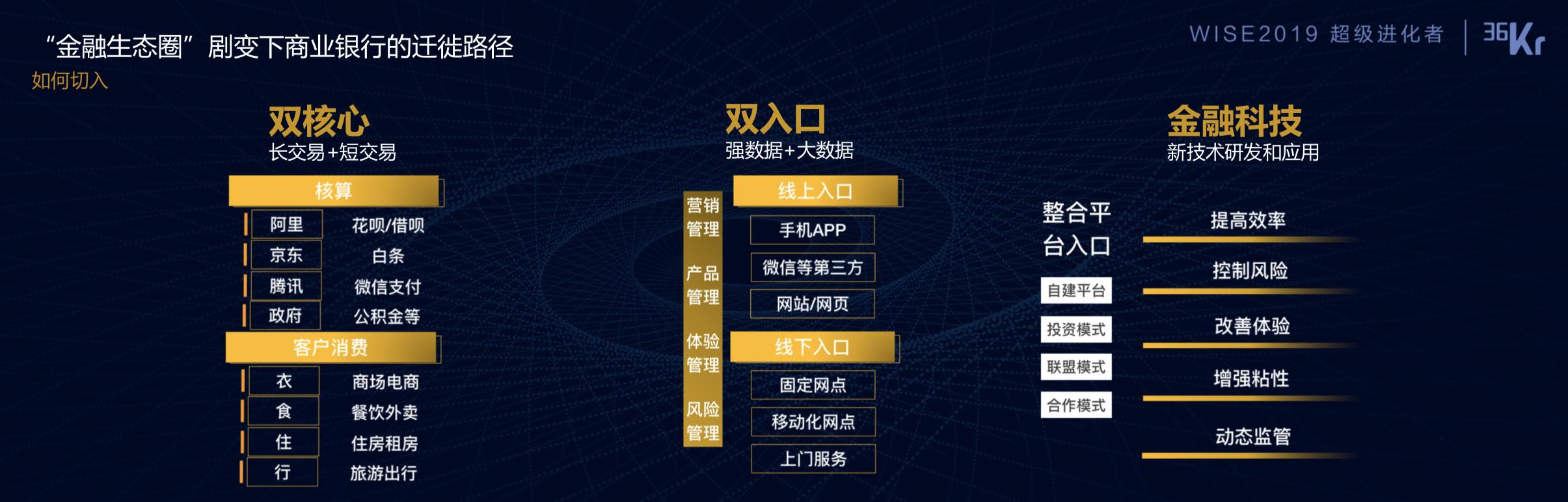 从哪切入?银行有它的优势,或者传统金融机构有它的优势,就是牌照、品牌、信用,有存量的资产和存量的客户。它的痛点是迭代不足、客户体验不够、场景缺失、交易成本过高。痛点这块是最好的切入点。以现在的说法认为是入口,入口端借助互联网金融技术,包括各种新的消费金融场景,做了很好的切入。关键的点是解决痛点,如何解决?目前的状态是这么一个状态,首先是中间这块双入口。这三件事围绕一件事做,就是金融机构的数字化转型。