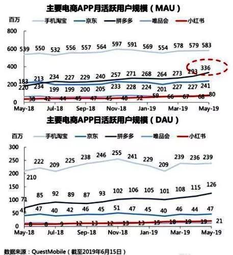不只是618期间,据QuestMobile截止2019年6月15日的最新数据显示,拼多多日活(DAU)已高达1.26亿,五月份月活(MAU)大幅增长至3.36亿,环比4月份MAU的2.93亿,单月净增4000万活跃用户。其中拼多多首页的“限时秒杀”在其中起到了非常大的外部引流效应。