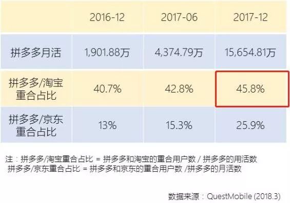 光便宜还不行,得有区分度。根据企鹅智库和QuestMobile大数据呈现的《拼多多用户研究报告》显示,2018年4月前的样本数据表明,在所有电商平台中,拼多多和淘宝用户重合度更高,2017年底,有45.8%的拼多多用户同时也是淘宝用户。两个平台中部分人群出现高度重合性。