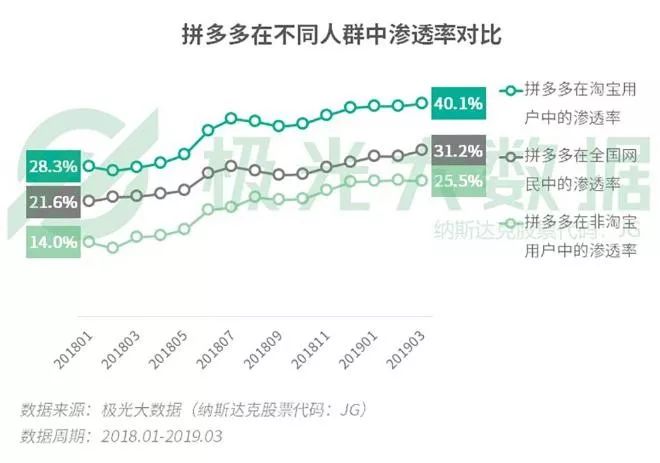 与此同时,拼多多对手机淘宝用户的渗透率也在提升,从去年同期的28.3%上升到了40.1%。每10个手机淘宝用户有4个装有拼多多,比例显著高于非淘宝用户。