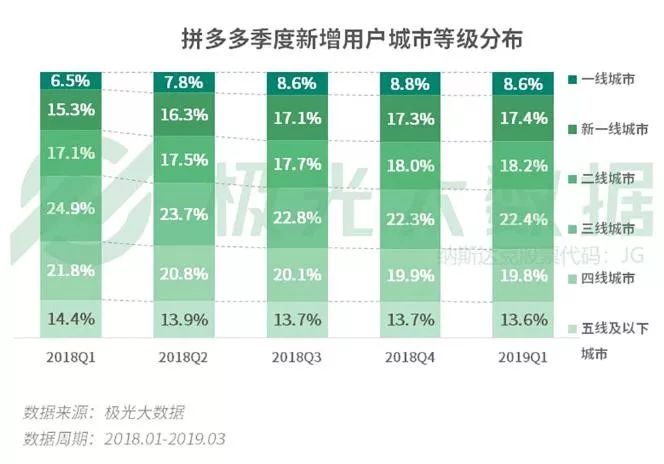 而在极光大数据发布的《2019年Q1移动互联网行业数据研究报告》中显示,截至2019年第一季度,拼多多的新增用户中有44.2%来自二线及以上城市,呈持续上升趋势。