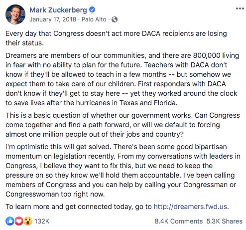事实上,在《硅谷帝国》一书里提到,苹果、Facebook、Google 和微软就曾主动批评川普总统退出巴黎气候协议。(当时马斯克更是称,如果退出巴黎气候协议,他就退出总统的咨询委员会)。Facebook 创始人小扎也曾跟 DACA(“青少年暂缓遣返项目”)的逐梦者见面,要求不要废除该项目,从而保护这些年轻时来美的非法移民。
