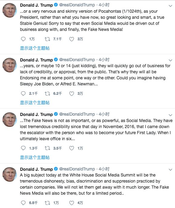 用川普今天发表在推特上的话说就是:“今天白宫社交媒体峰会的重要主题将是讨论某些公司存在的巨大的不诚实、偏见、歧视和压制问题。我们不会让他们一直逃避这个问题。” 而且看得出来,川普对假新闻也是深恶痛绝。