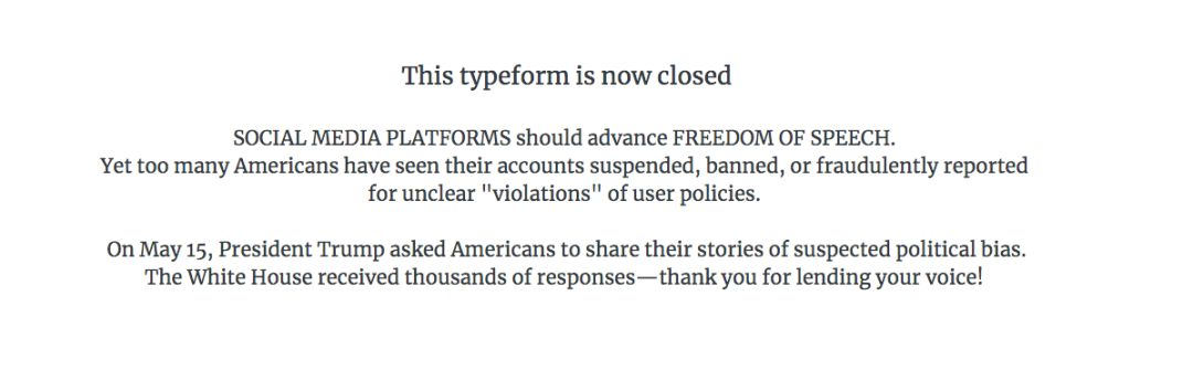原来,白宫在今年 5 月短暂上线了一个网站,是征求美国民众关于在线偏见(online bias)的意见,白宫希望民众分享在网上是如何遭遇各种偏见的。如今,这个项目网站已经被关闭了。