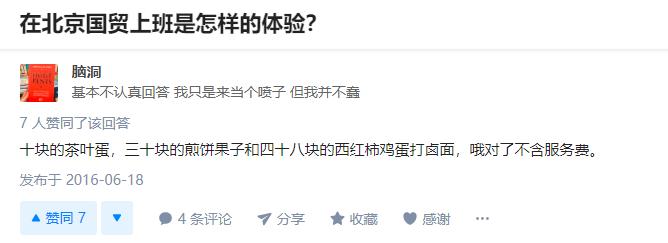 (图片说明:知乎网友对“在北京国贸上班是怎样的的体验”这一问题作出的回答。图片来源:知乎)