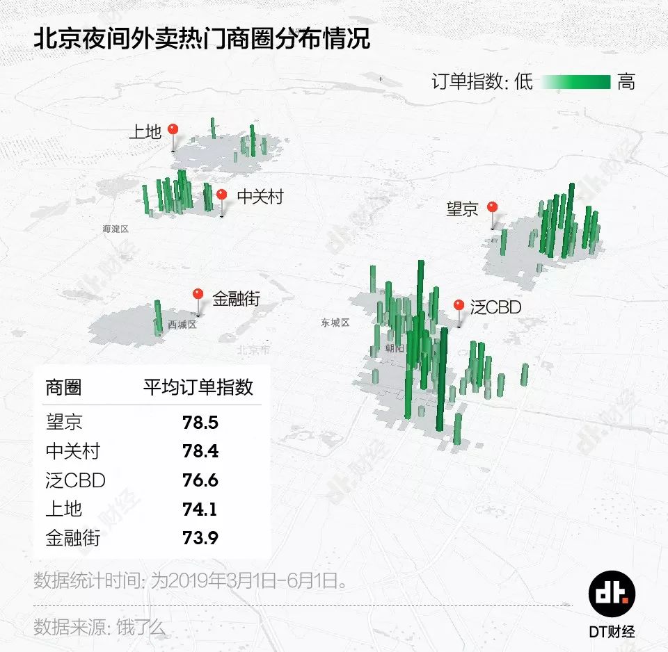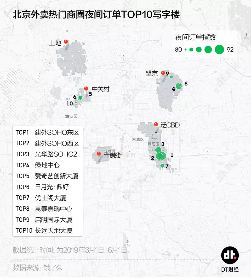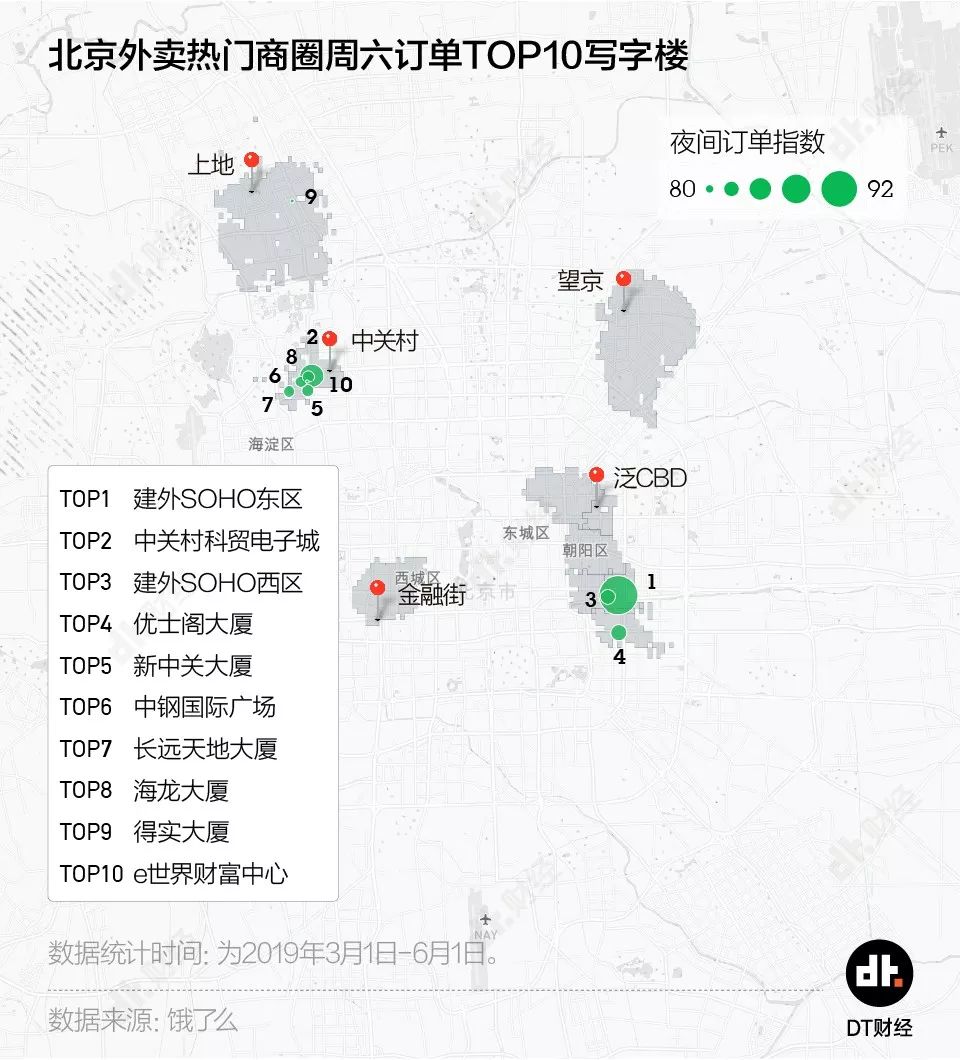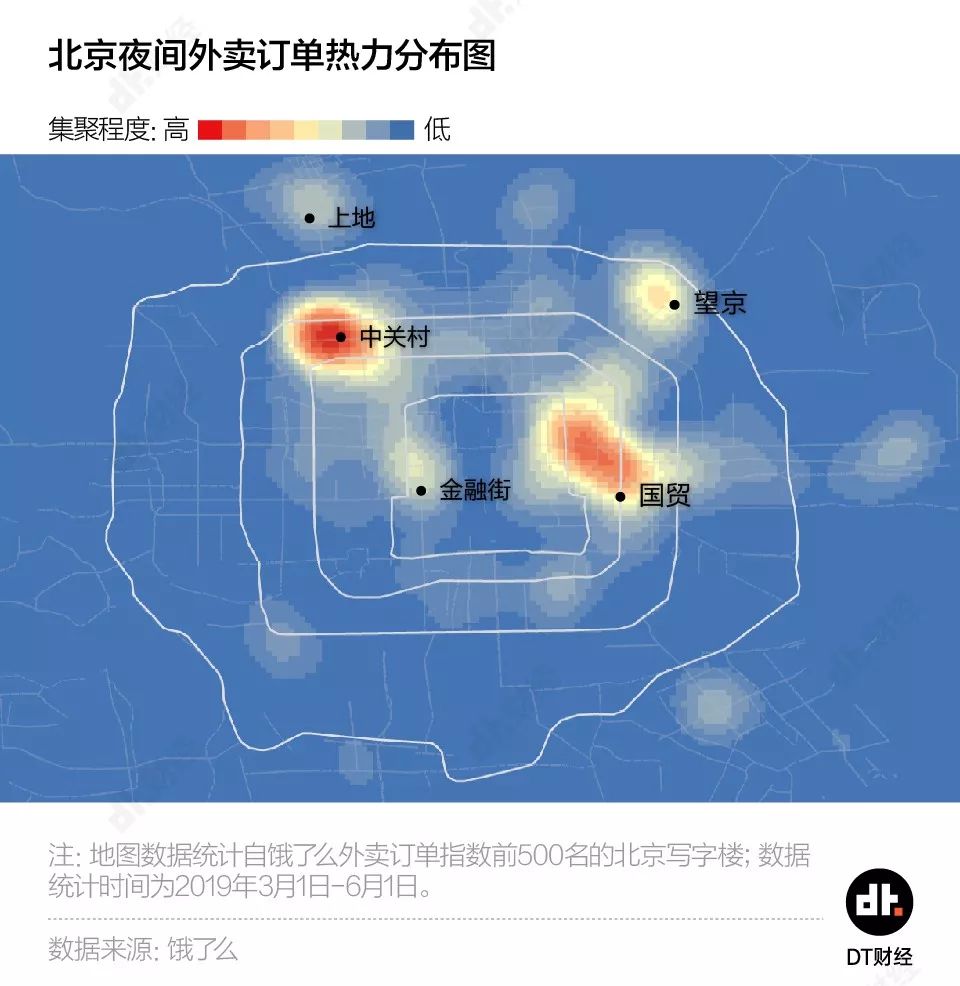 根据饿了么的外卖订单指数高低,DT君将这几个商圈的加班写字楼堆叠在地图上。
