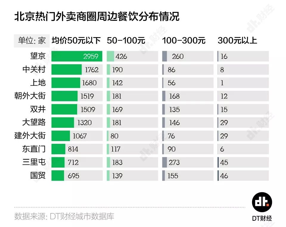 DT君特地查看了建外SOHO所处的国贸,其周边平价餐馆数量只有中关村四成多。或许均价300元往上走的餐厅才更衬得上CBD的气质。但对于在这里熬夜加班的国贸girl来说,楼下高大上的馆子只能偶尔出现在朋友圈里,毕竟公司给的餐补可能还不够点一道沙拉。
