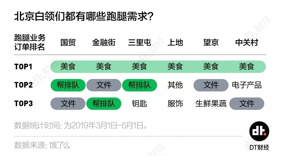 饿了么夜间的跑腿订单显示,国贸和三里屯人在干活间隙还不忘call上跑腿小哥帮排队,大概是工作肝的越辛苦,就越需要网红店来治愈?望京人表示不懂,他们还是比较喜欢买买生鲜果蔬,追求更健康的生活方式。