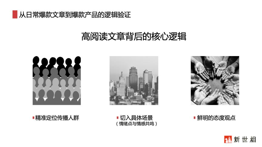紧接着便是从日常爆款文章到爆款产品的逻辑验证:是否精准定位传播人群、是否切入具体场景以引发情绪点与情感共鸣、是否拥有鲜明的态度观点,都是高阅读文章背后的核心逻辑。同时爆款文章的逻辑思维还同样可以运用到视频产品中。