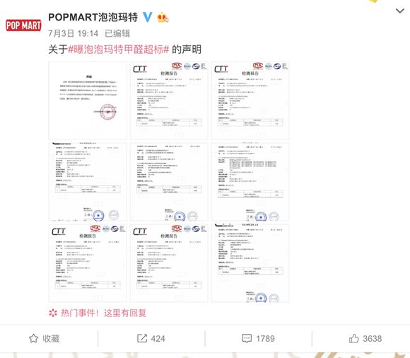 针对甲醛事件,POP MART官方不得不快速反应,发布已经送检的声明,以暂时纾解用户的负面情绪。