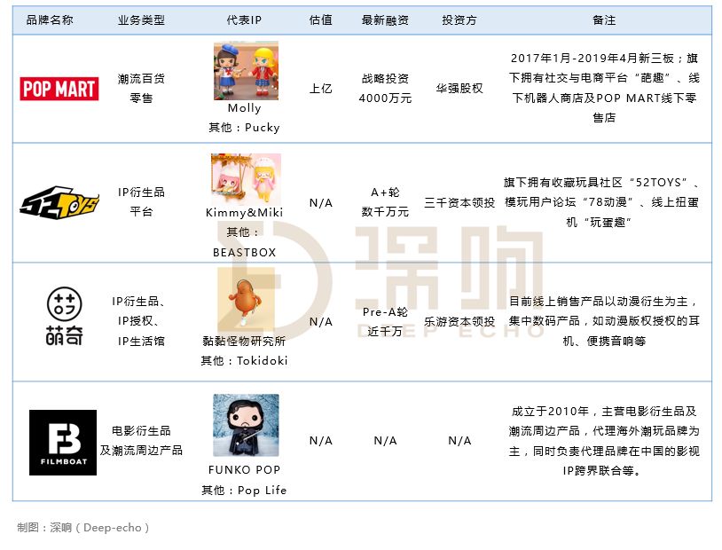 也有一部分海外品牌则选择找国内厂商代理,IP衍生平台应运而生。除了POP MART以外,还有像52TOYS、萌奇、影舟子等一系列IP衍生和孵化平台,都在试水或已经进入了潮玩市场。他们在获取IP授权以后,会负责进行产品后续的制作、宣传或销售。52TOYS更是在2019年3月的A+轮获得了数千万元的融资。这些涉及到潮玩的平台,都将成为POP MART潜在的竞争者。