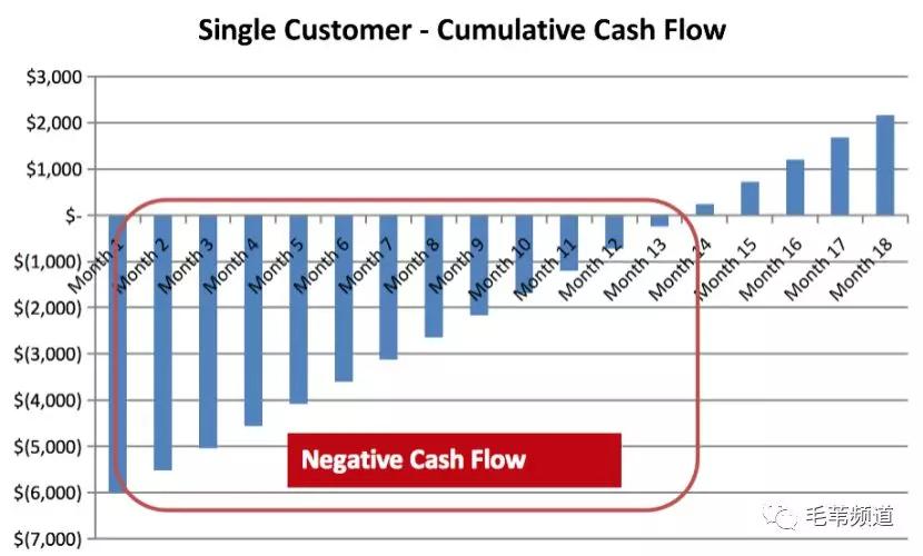下图是累积现金流模型,表现的是同一家客户累积起来的现金流状况,我们看到他在前13个月都是负现金流,到了第14个月开始盈利,实现了正现金流。