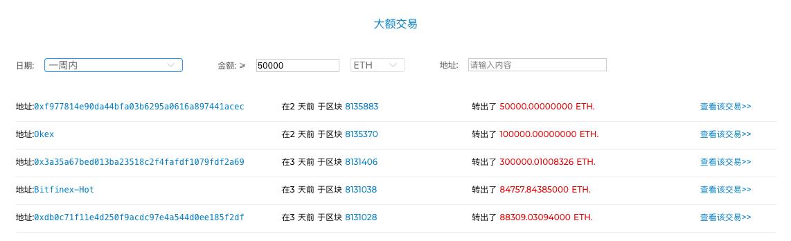 另外“转账超过5万ETH”的共计 9 笔,最大数额达到 190 多万ETH,该笔转账为币安冷钱包向外转出,目前尚未拆分;另有 4 笔转账是交易所内部钱包互转,剩余 4 笔转账系未知地址互转,这些地址排名并未进入富豪榜前 100。