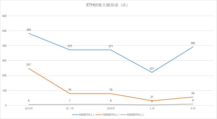 Tokenview数据显示,“转账5千ETH以上”和“转账1万ETH以上”数量大幅上升,环比上涨均超过70%,其中转账次数最多的时间为周四。