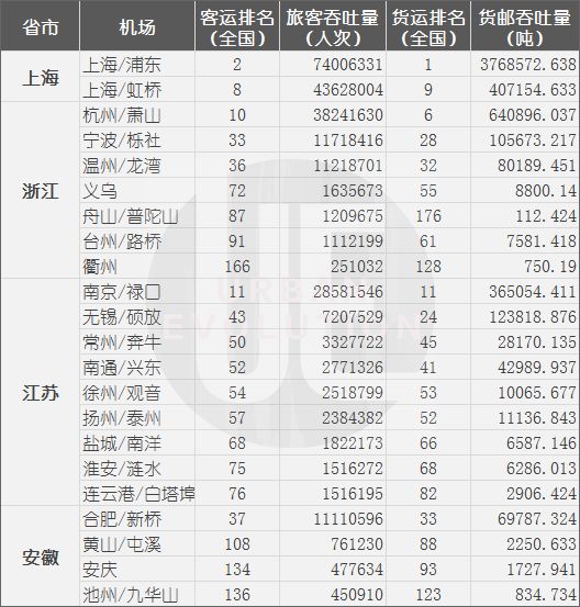 城叔对长三角机场资源进行了统计,根据《2018年民航机场生产统计公报》,目前长三角城市群共有22个机场,总客运、货运吞吐量分别占全国19.6%、34.0%。