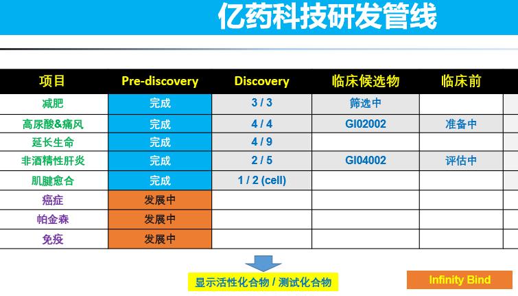 据「亿药科技」联合创始人薛宝玉介绍,「亿药科技」基于AI开发了具有深度学习能力的算法系统,包括药效学预测平台InfinityPhenotype,可针对特定功能进行预测和设计的算法模型,能让化合物活性预测准确率提高到30-70%;以及基于化学分子系综的药物设计平台InfinityBind,能针对300多个常用靶点做新分子设计、双靶点分子设计。