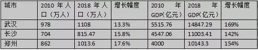 2008—2018年,武汉、长沙、郑州GDP、人口增长数据 制图:西部菌